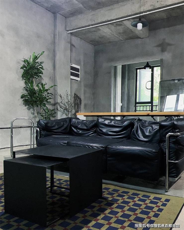在餐桌前面放沙发和茶几,你别说,这黑色的沙发和茶几相互搭配,和家里的水泥风装修还真是格外搭配。