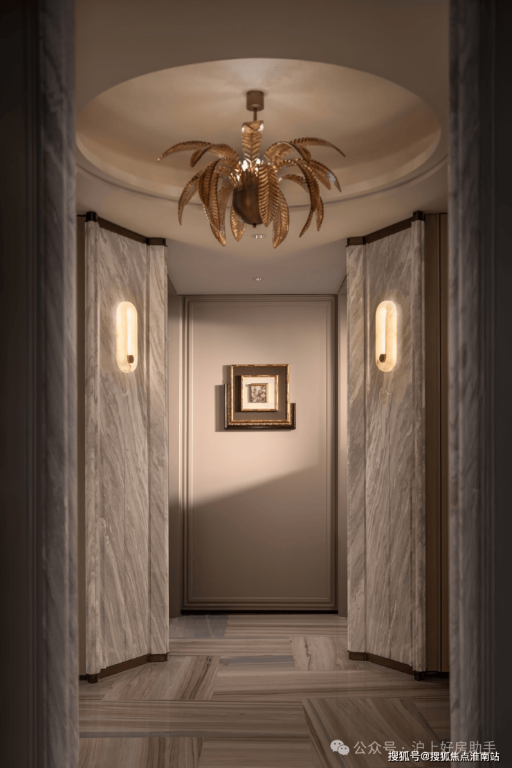 经典十字序列厅:从私享电梯厅开始,经由对开入户门,首先就进入这样一个十字序列厅,视线远处,就是尽头观景台,这条长廊,可以是公私分区的交通枢纽,也可以是彰显主人品味的艺术长廊;
