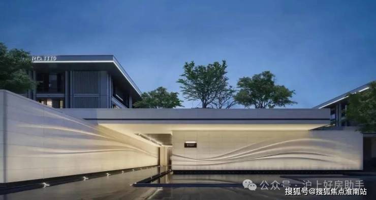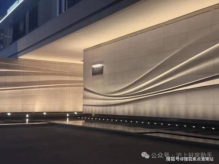 采用米黄色温润石材,巧妙模拟风的流畅形态,营造出既庄重又舒适的归家氛围。这片宽广的流线型石墙在柔和灯光的映衬下,更显璀璨夺目,而风雨连廊的灯带设计,更添一份尊贵仪式感。