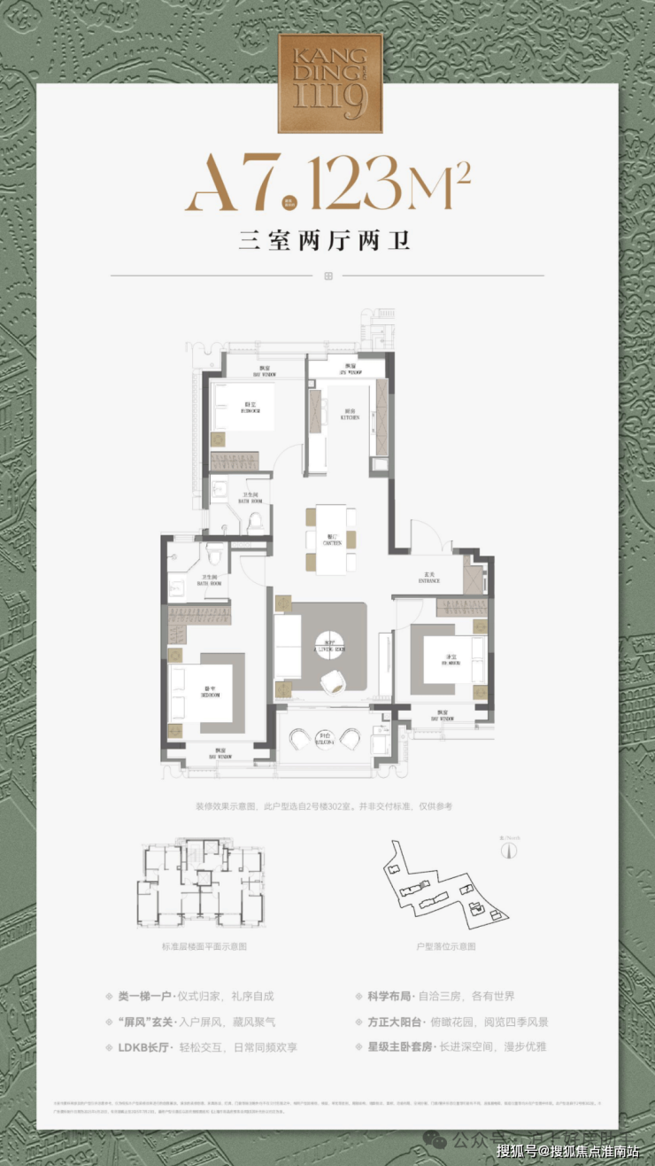 建筑面积约123㎡三房户型,飞机式布局,一镜到底的LDKB长厅,尽显隐贵静安风范;