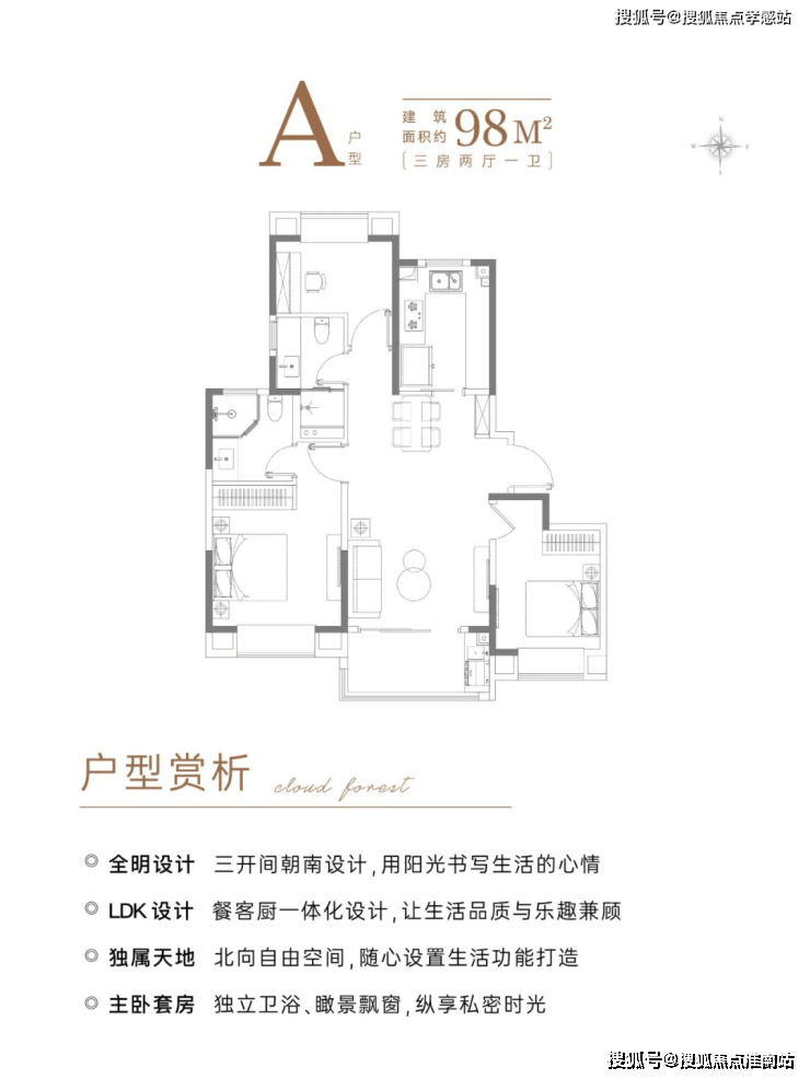 建面约98㎡3房:可以说这款户型满足了市场对刚需、刚改入门面积的所有需求,经典的三开间朝南飞机户型设计,最大化利用空间,减少面积浪费,整体格局方正南北通透。