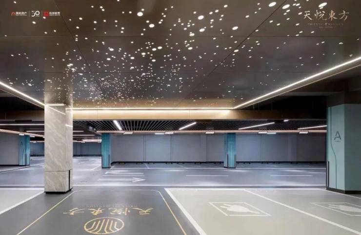 比如豪华星空顶地库,顶部星光顶是穿孔铝板,搭配LED灯带,满满科技感。车道做了格栅样式的吊顶,地面采用橘皮环氧地坪,既保证了美观度,又非常实用。