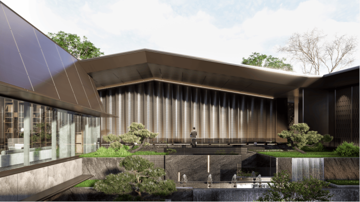 日清设计的宋照青亲自执笔,创造性地用现代东方极简风格,不仅极大尊重了苏式传统和文化,打造出340㎡下沉庭院,更用宽10米,高4米的水瀑打造出会所的立体空间。