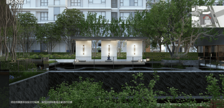 静心水院,400平镜面水景,与大师建筑两两相望;选用黑金砂花岗岩,波纹荡漾中,倒影与池底辉映,更显星级酒店式的静谧与雅致。
