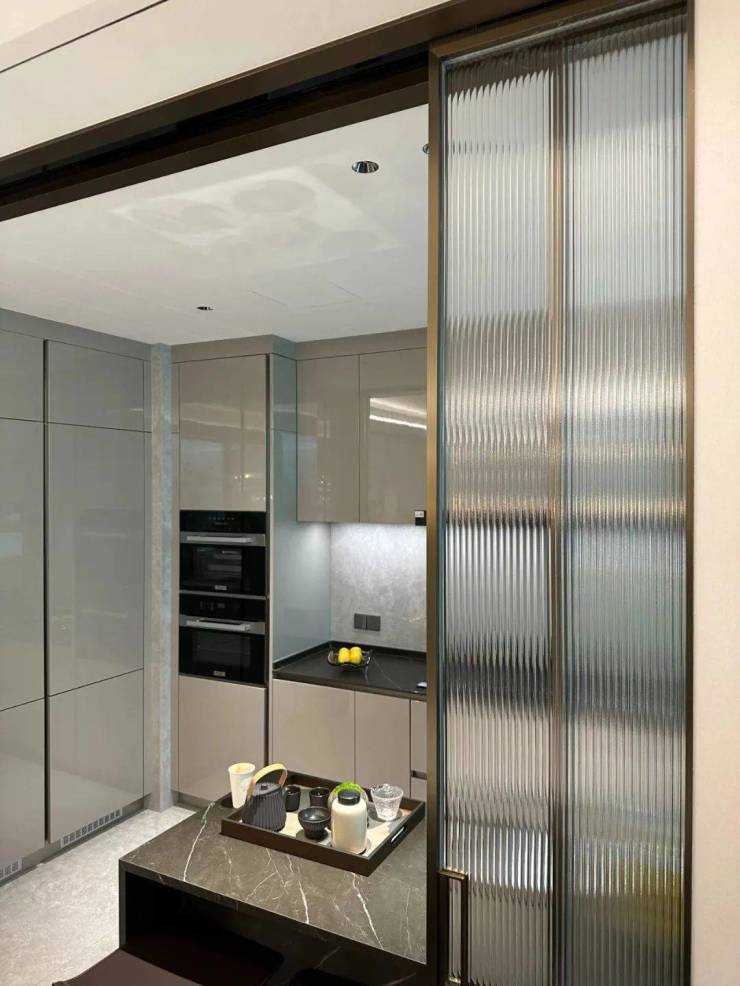 厨房玻璃门是 上轨道移门 ,意味着地面部分没有任何轨道,不会有灰尘积攒,炒菜时关上,避免油烟散入室内;平时拉开,可以扩充室内视觉感受。