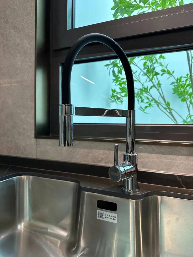 水槽也是一个 大单槽, 放得下炒锅汤锅这种大物件~ 抽拉式龙头 ,清洗大水槽的时候很方便,360度旋转伸展自如,这款弯管还是 硅胶材质,柔软耐用有弹性 ,还可切换出水模式,出来的水柱也是很柔和细腻不飞溅。