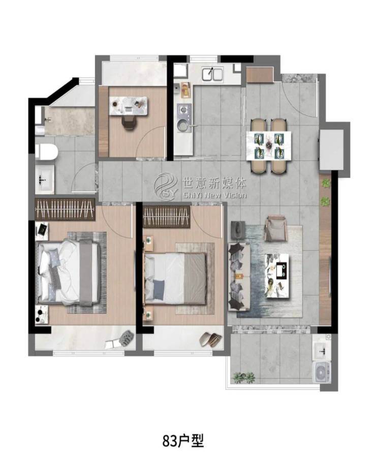 象屿深入考量空间与场景的运用,将生活中看得见与看不见的细节进行了细致打磨。玄关、阳台、厨房、卫浴均设置科学收纳空间,营造高品质生活体验的同时,更带给居者层建面约83㎡3房2厅1卫