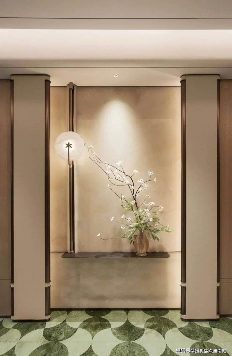 主卧的锤纹门把手、地板花瓣拼、镂花的空调出风口每一个都是世界级的工艺。同样,精装的用材也很考究,从电梯厅到室内各种奢材在这里齐聚, 瑞士翡翠、白雪公主、蒂芙尼绿、巴黎金等奢石,还有仿锤纹夹丝玻璃、仿古锈镜、隐木这些罕见用材增添艺术质感。