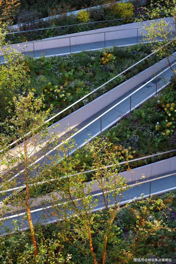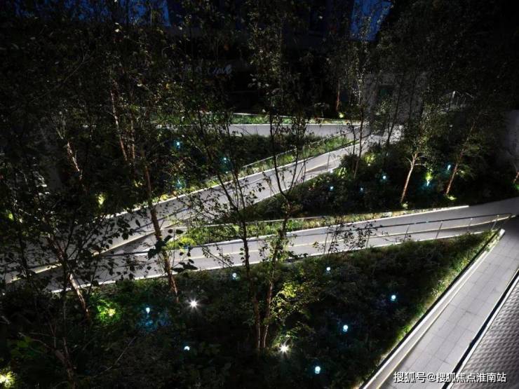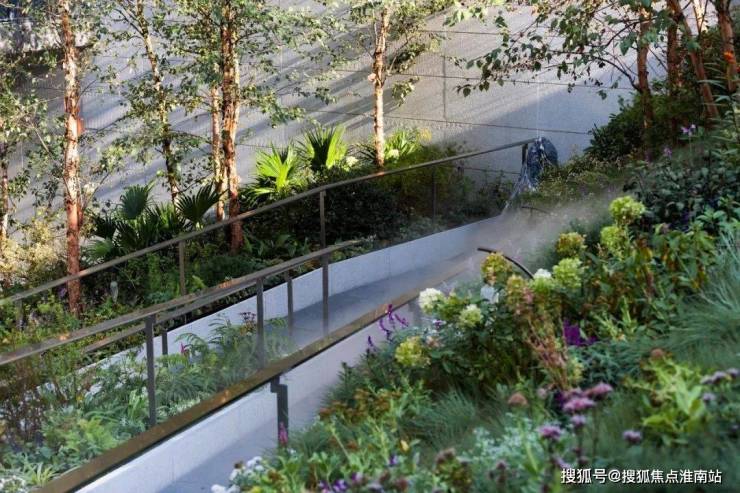 来到后场区域,设计希望将上部与下部空间通过大地造景手法,将公区景观融合进下沉庭院,使上下空间成为一个整体。下沉庭院曲折蜿蜒的步道呈五折逐级展开,完成了空间序列的塑造,并通过精心设计的花境景观,将它做成了一个空间丰富、开合有度、生机盎然的“仲夏夜之梦”主题花园。