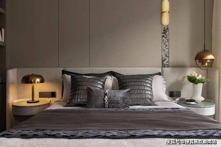 主卧室大气、质感,用简单的造型背景墙和圆形灯就渲染出了卧室的调性,仅用灰色和棕色便提升了空间的精致感。设计师钟爱用线条来映衬出空间的动静感。