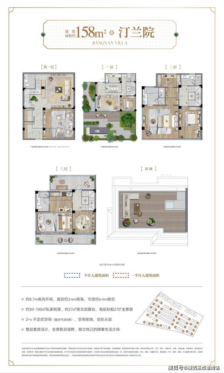 联排别墅:建面约133-158㎡,3层设计,首层挑空3.4米,二、三层层高3米,全装修交付(标准2000元/㎡起),总价268万元起,得房率及赠送率超200%