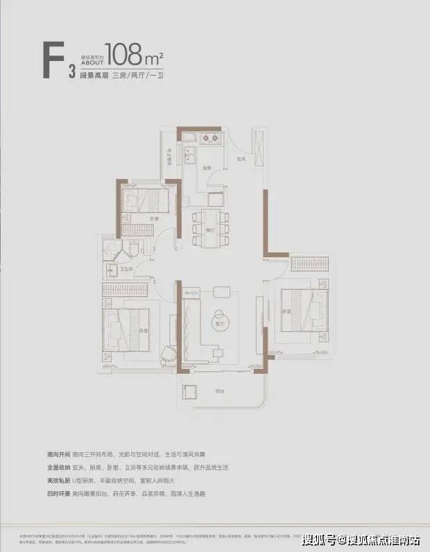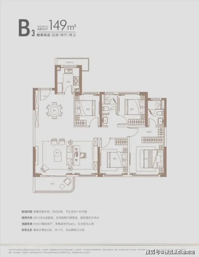 建面约140㎡四房:三开间朝南户型,南北通透,采光条件优质,客厅明亮宽敞,彰显大气布局。