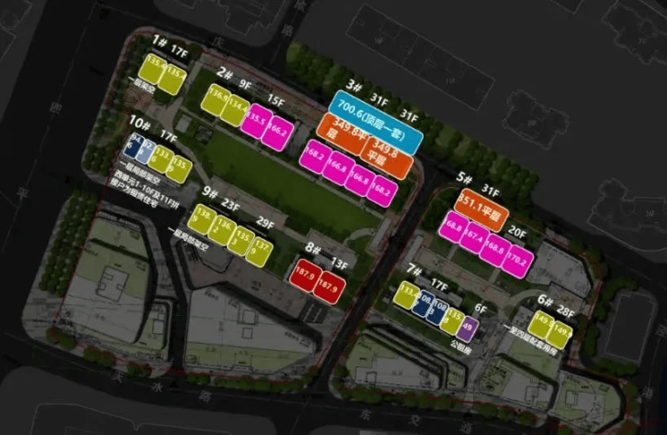 其中住宅建筑面积为9.71万㎡,由10幢高层组成;住宅楼基本都位于地块的北侧,南面则是办公和商业,预计可售住宅约586套。