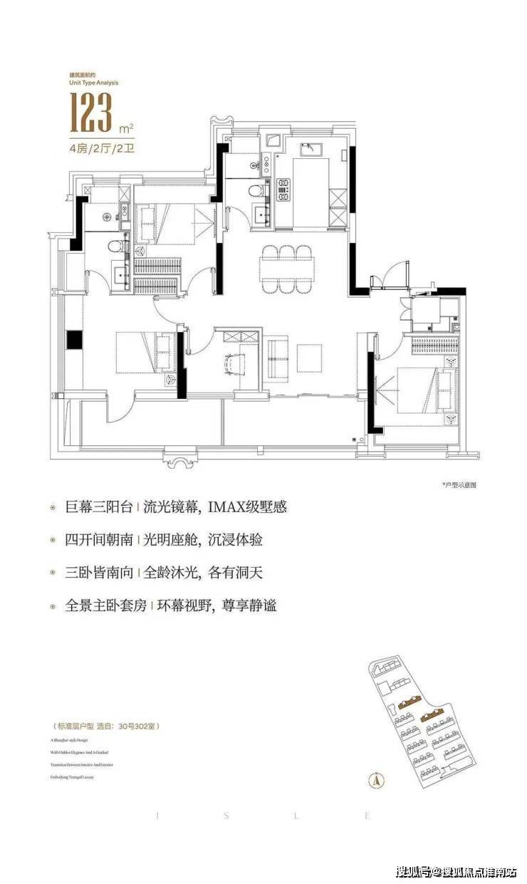 123平4房2卫,采用类一梯一户设计,非常少见的4开间朝南+4房南北通透户型。