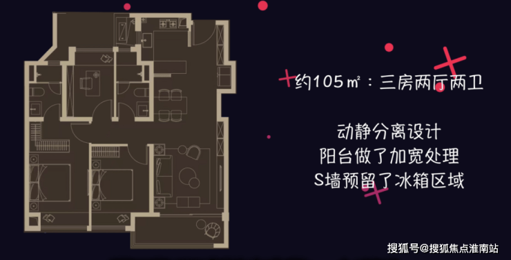 户型方面, 起步105平3房2卫,采用常规动静分离设计,亮点是阳台做了加宽处理,S墙预留了冰箱区域,入门就要接近500万级别。