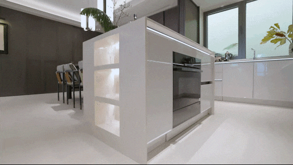 建面约140㎡以岛台交付,蒸烤一体机、暖碟抽屉随时待命,壁龛储物空间暗藏感应灯带,更是为厨房增添了一份实用与美观。
