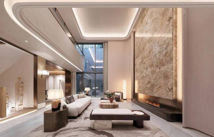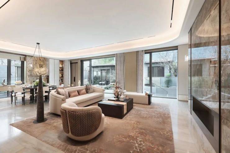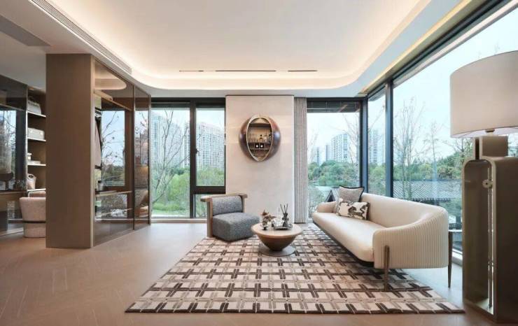 所有线条都向上生长,指向那片独特的天花,柔和的光晕如一层薄雾轻轻笼罩。地毯的暗纹是静默蔓延的根系,将沙发、单椅与边几温柔连接。