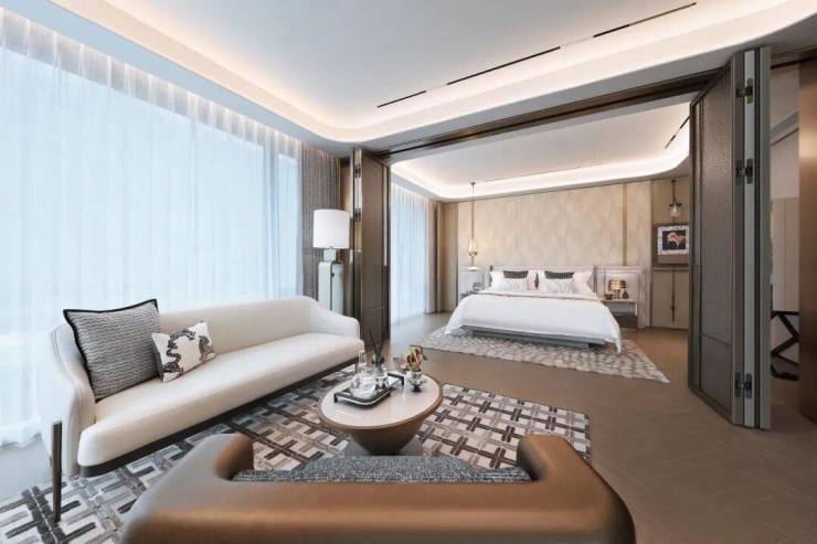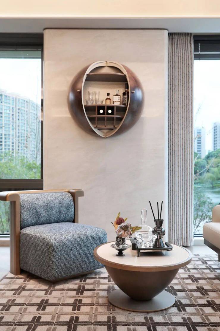午后,移步至更开阔的休憩区,沙发以柔软的姿态承接身体,点缀着竹叶图案的抱枕在不经意间流露东方雅韵。深色柜门内的灯光悄然亮起,静静陈列的不仅是佳酿,更是一段可供品味的时光。
