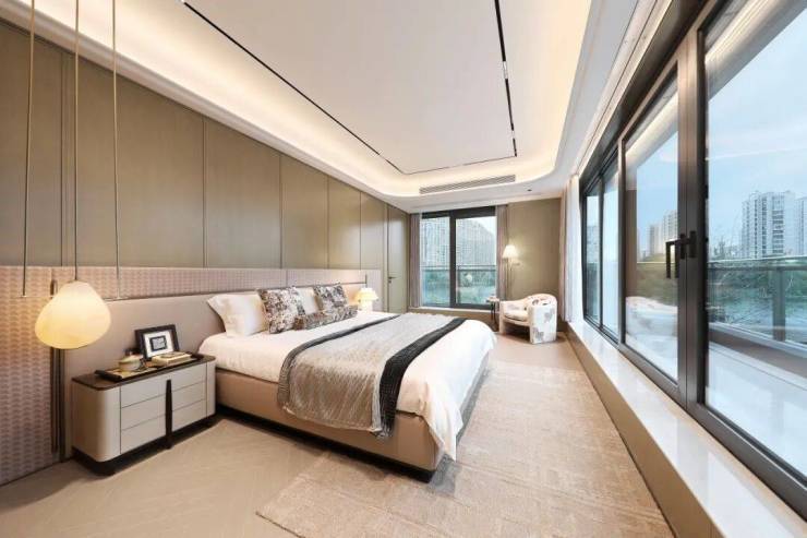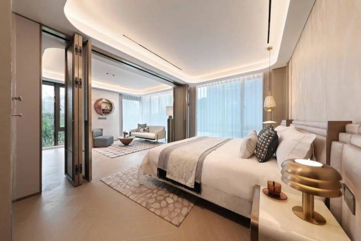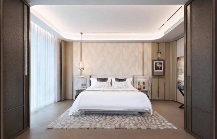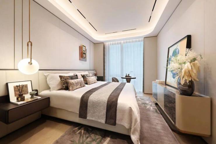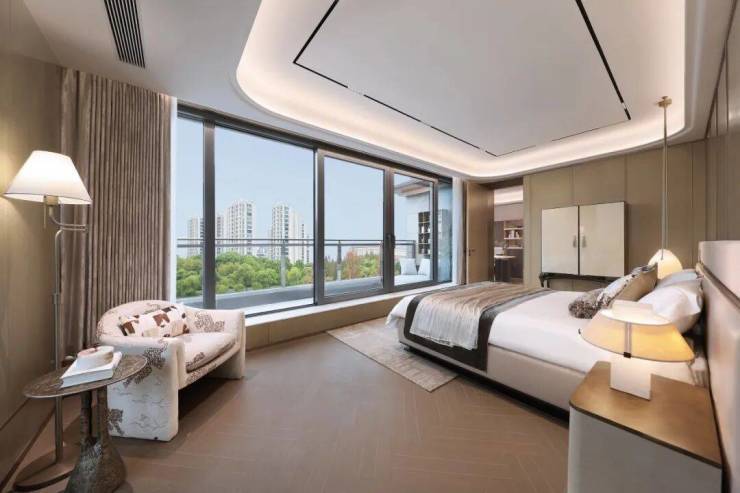 这不止是一间卧室,更是一座定制的私人艺术馆。两侧床头,温暖的木质纹理,一盏水滴形艺术吊灯倾泻暖黄光晕,渲染了夜与晨的边界。一日的序章,在窗边的阅读角落展开。