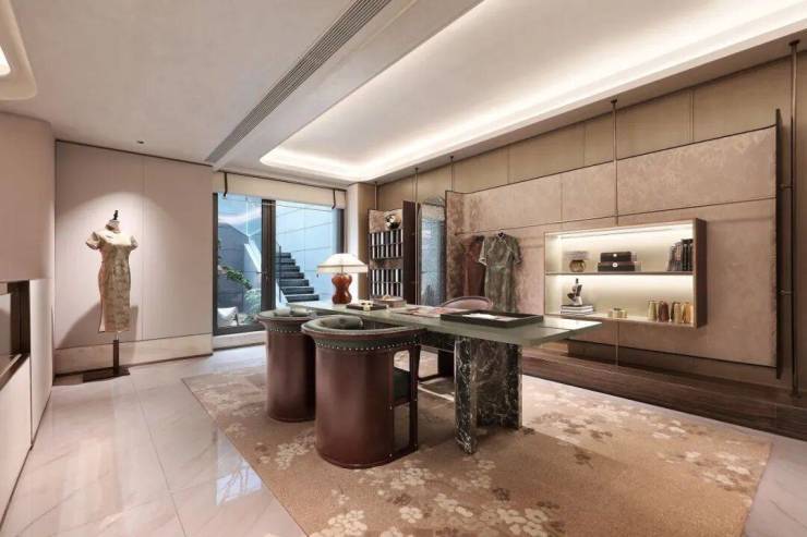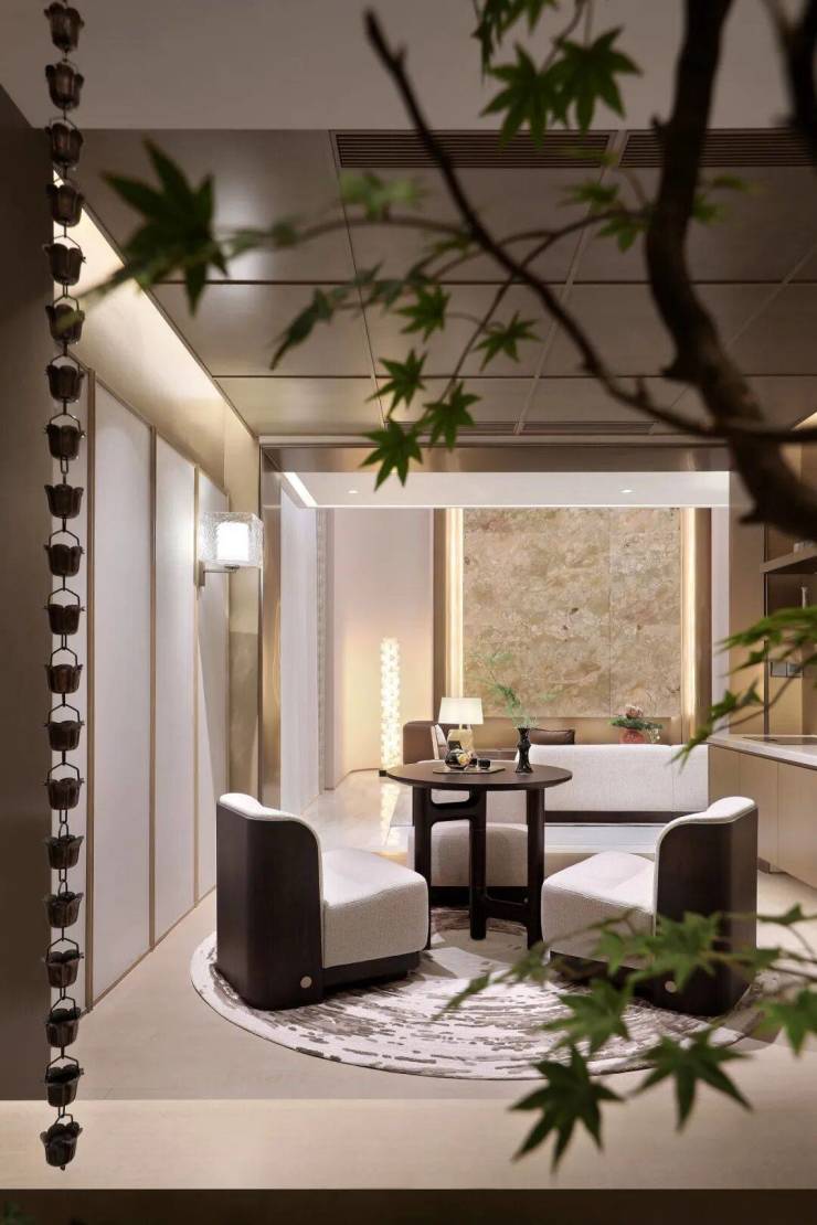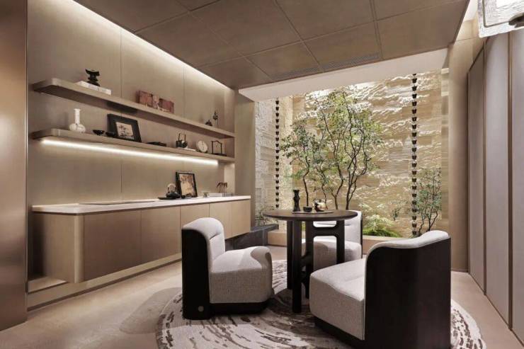 茶室中的柜体如舒展的绢帛,与深邃台面形成静默。两把座椅以米灰为底,深棕为韵,在纹理细密的地毯上围合出一方岛屿般的闲适。