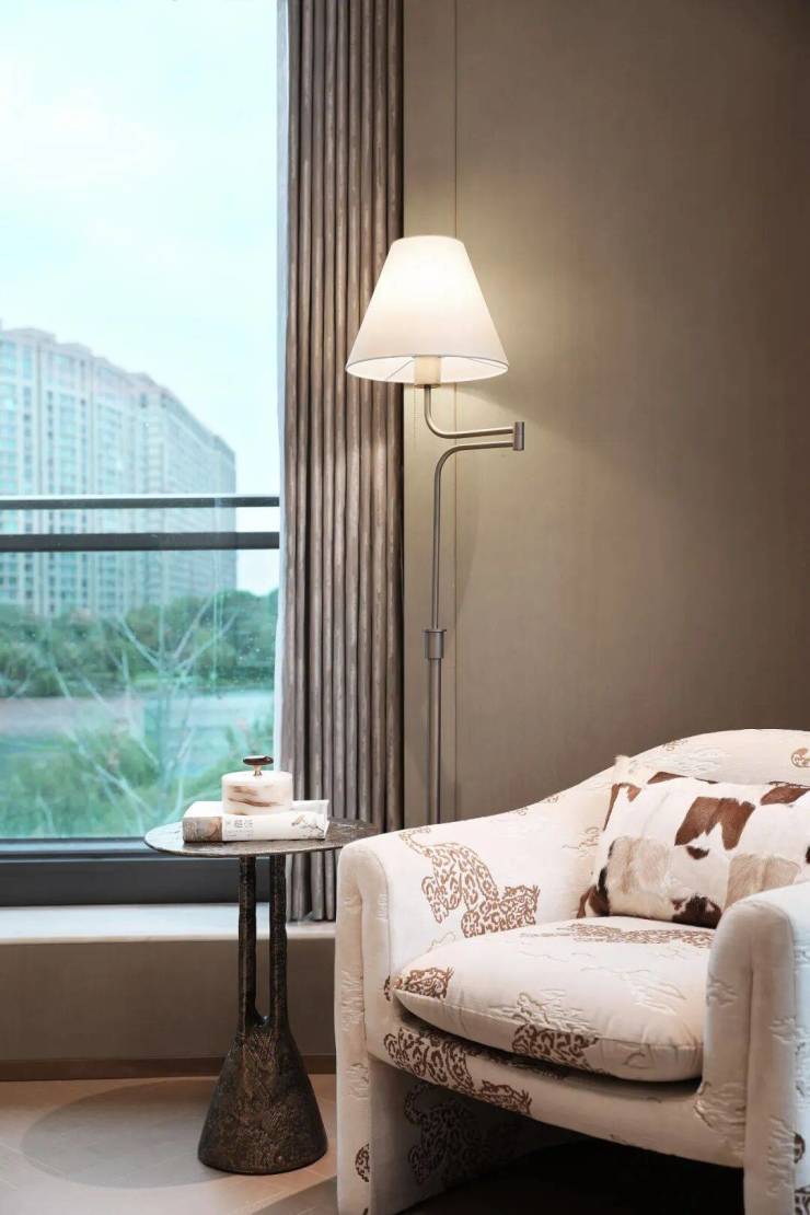 视线转向起居室,最柔软的笔触,是那道浅米色的沙发,点缀其上的抱枕,仿佛是云中绽开的朦胧影子。与之对话的灰色单人椅,则以沉稳的砾石灰,写下了铿锵有力的句点。茶几如一方悬浮的圆岛,承载着微缩的景观。