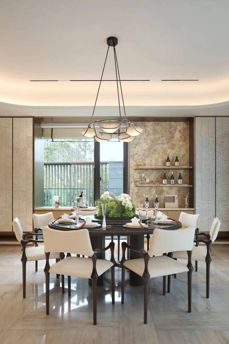 开放的餐厅区域悄然衔接,餐桌餐具摆放齐整,静候着温馨的飨宴。餐厅焦点为一盏悬浮式云石吊灯,以质感,将光芒内敛为底蕴;以深情,将时光凝固成诗。