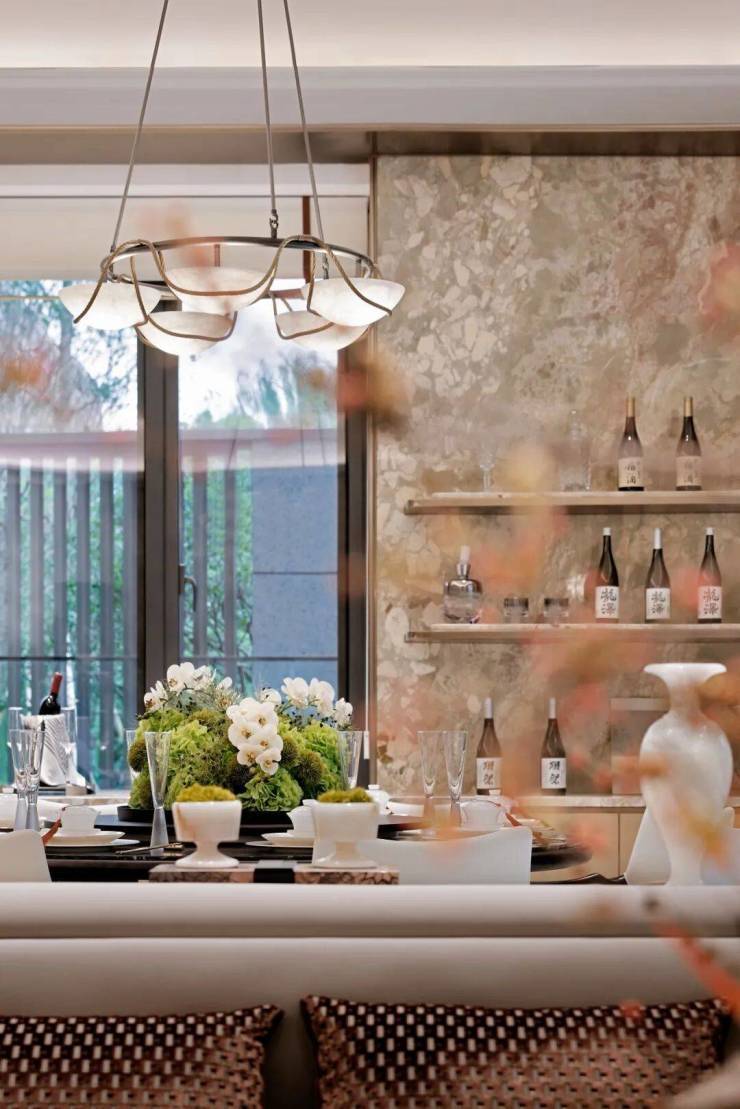 The open dining area seamlessly connects, with tables and tableware neatly set out, awaiting a warm and inviting feast. The focal point of the restaurant is a suspended marble chandelier, its texture subtly enhancing the understated elegance of its light; its deep affection freezing time into a poem.