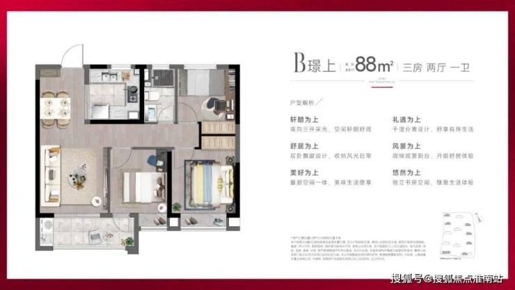 建面约88㎡3房2厅1卫户型,做到了三开间朝南+双朝南卧室带飘窗+动静分离,采光面拉到极致的小3房。