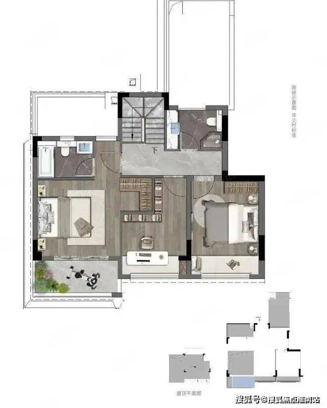 上叠可拓展屋顶露台,面积约40-60平不等。
