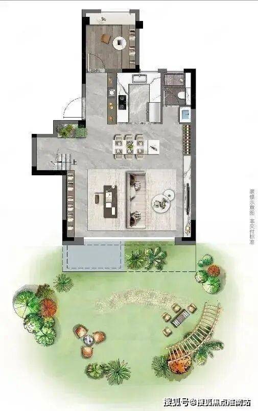 上叠户型,一层LDKB一体化客厅+两个房间,可做老人房或客房。一体化客餐厅直接连通门前绿化,附赠约40-300平庭院。