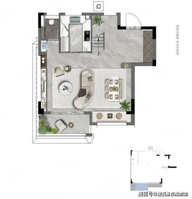 一层,LDKB一体化设计客餐厅,客餐厅连通270度阔景阳台;