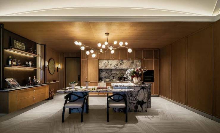 开放式的西厨设计,大理石岛台连接同款餐桌,让每一餐的仪式感更加时尚有度!
