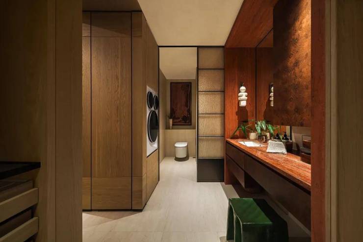 此外,卧室、卫生间这些空间,从材质对碰到光影设计,都进一步强化了“酒店式生活”的场景感,突出一个松弛+私密感。
