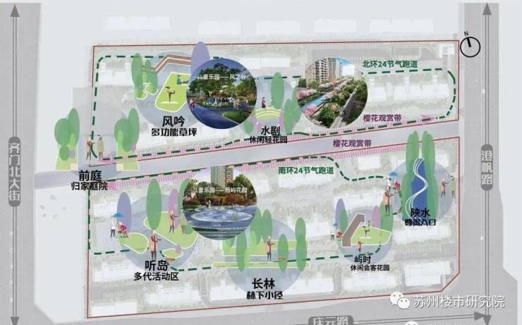 南北区:共计约1500M,与儿童活动、老年乐园、中青年健身平台、阳光草坪、休闲交流等贯穿,加之24节气,形成不同的功能体验。