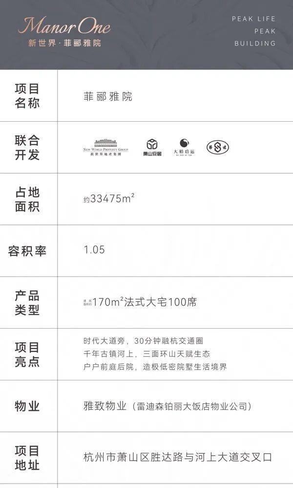 浙江新世界继杭州之门东塔OPUSONE之后ONE系列又一扛鼎续作ManorOne菲郦雅院,落子杭州南部河上古镇,临时代大道,筑奢雅墅区,敬献杭城峯层人物。