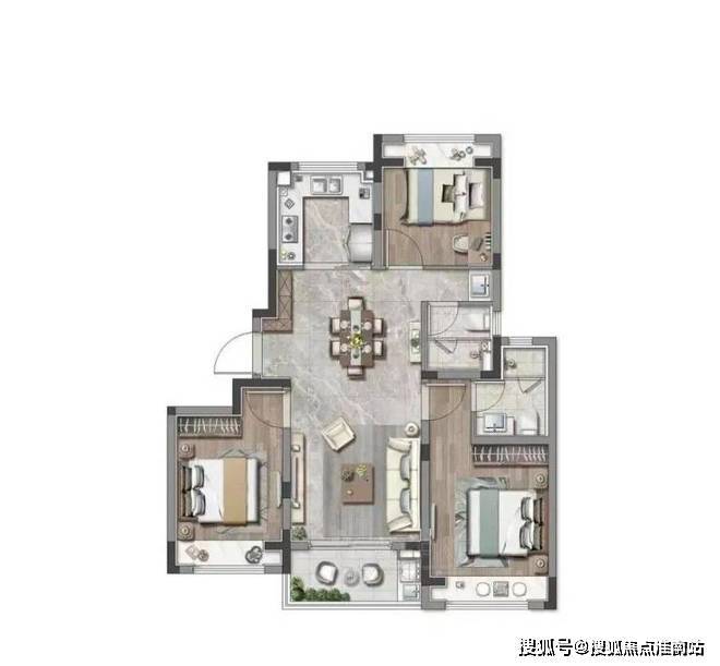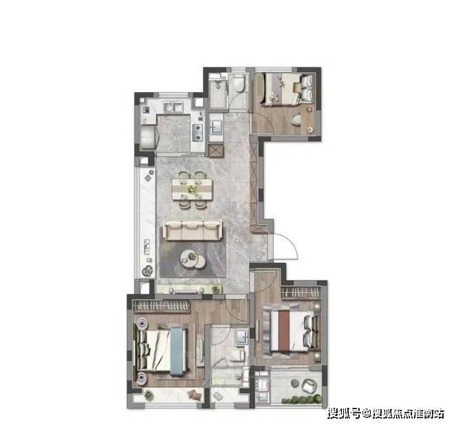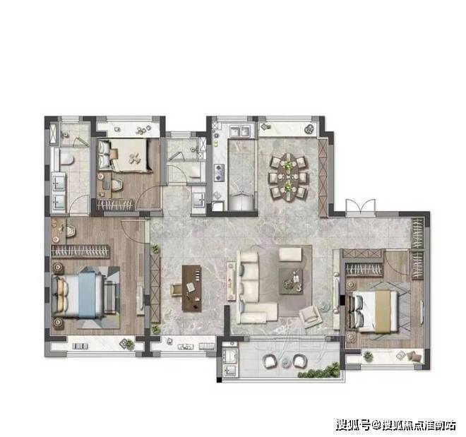 餐客厅一体化设计联通景观阳台,主卧套房设计,私密性好,舒适性与实用性俱佳。