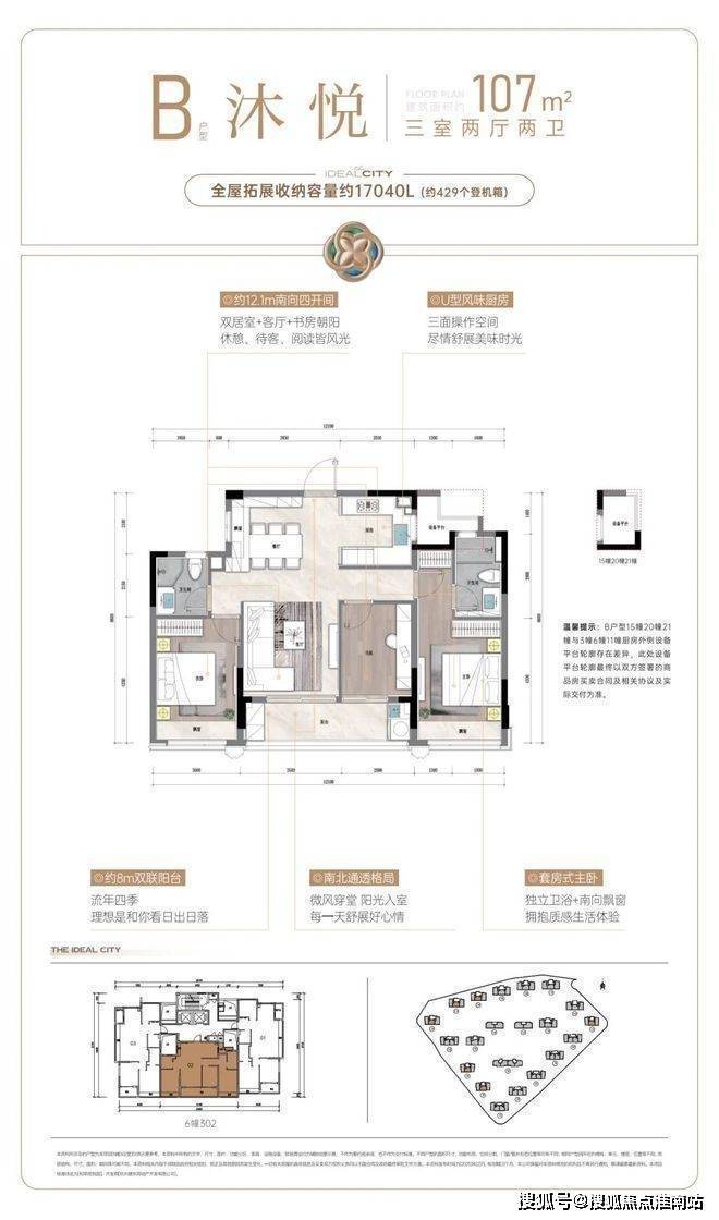 建面约107方户型则把重点放在舒适度上。