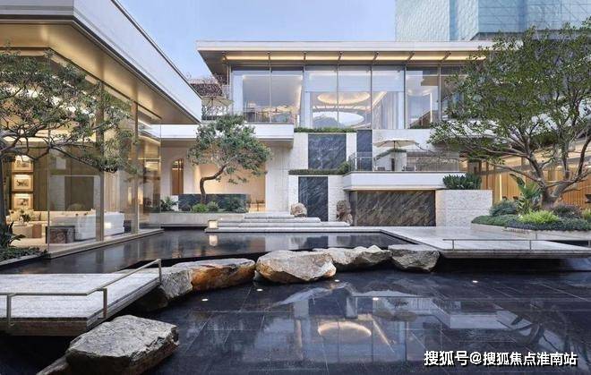 下沉式庭院 作为和萃揽悦园的关键归家场景之一,搭配波光粼粼的镜面水景和松柏点缀,有一种“明月松间照,清泉石上流”的人文意境了。