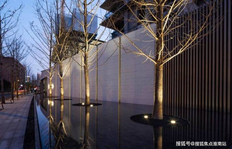 景墙下的镜面水景池壁的铜板由现场开模浇筑制成,表面经打磨形成类似自然水波纹理的的肌理质感,充分展现了本项目的高定感。
