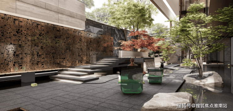 比如下沉庭院,臻选并移植黑松到庭院之内,辅以龙鳞地面铺装,营造《松林龙蜕》诗内老松虬枝苍劲,如龙盘踞的意境。同时以山石层叠、高低景墙和坡度草坪创作一个可容纳小型沙龙的环形聚落,再现《九峰环翠》的山石意向。
