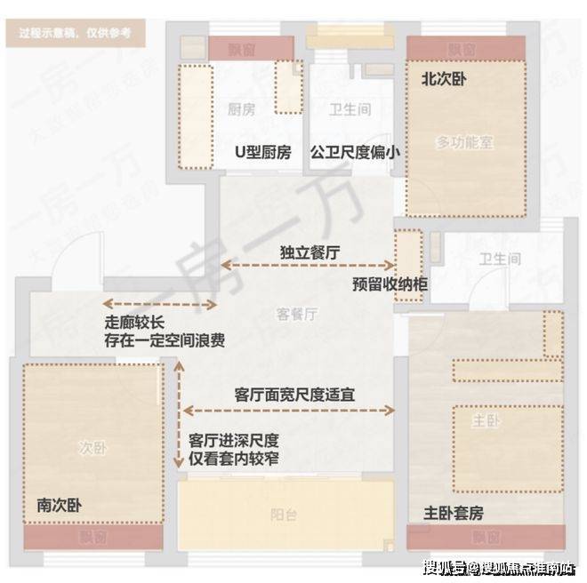 此外,北侧厨房与卫生间开门并列,距离稍微有些近,如果介意的朋友可能需要实际感受一下再做评判;