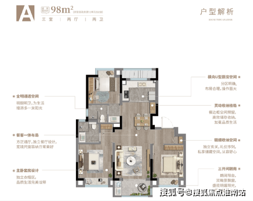 · 厨房采用U型空间设计,利用率更高,且预留了可容纳双开冰箱的位置。