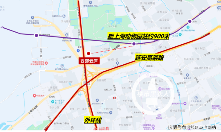 交通方面,直线距地铁10号线上海动物园站约900米,可快速直达虹桥枢纽。自驾的话,项目本身就在延安高架、外环高架围合之内,交通便利,通达全城。