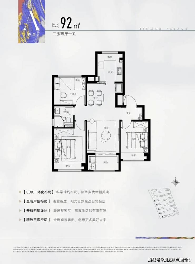 建面约92㎡3室2厅1卫户型,做到了三开间朝南+LDK一体化布局,延伸了室内实际可使用面积,采光、通透性都非常不错。