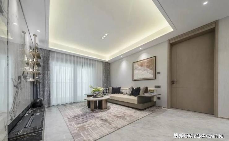 金茂定制壁布或墙纸交标结合芬迪白岩板客厅背景墙,地面采用马可波罗(或同等品牌)大板砖,以定制设计感提升空间立体感。