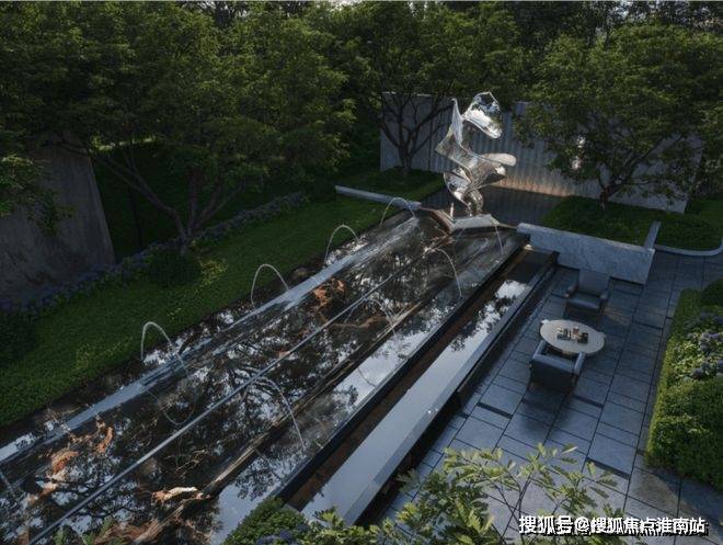 前场花园以兰特庄园为设计灵感,明确的中央轴线贯穿,中心喷泉顶端放置了应晶晶的山海金阙,以秩序中的自然理念通过几何布局、水景艺术和人文符号加功能美学与哲学融为一体。