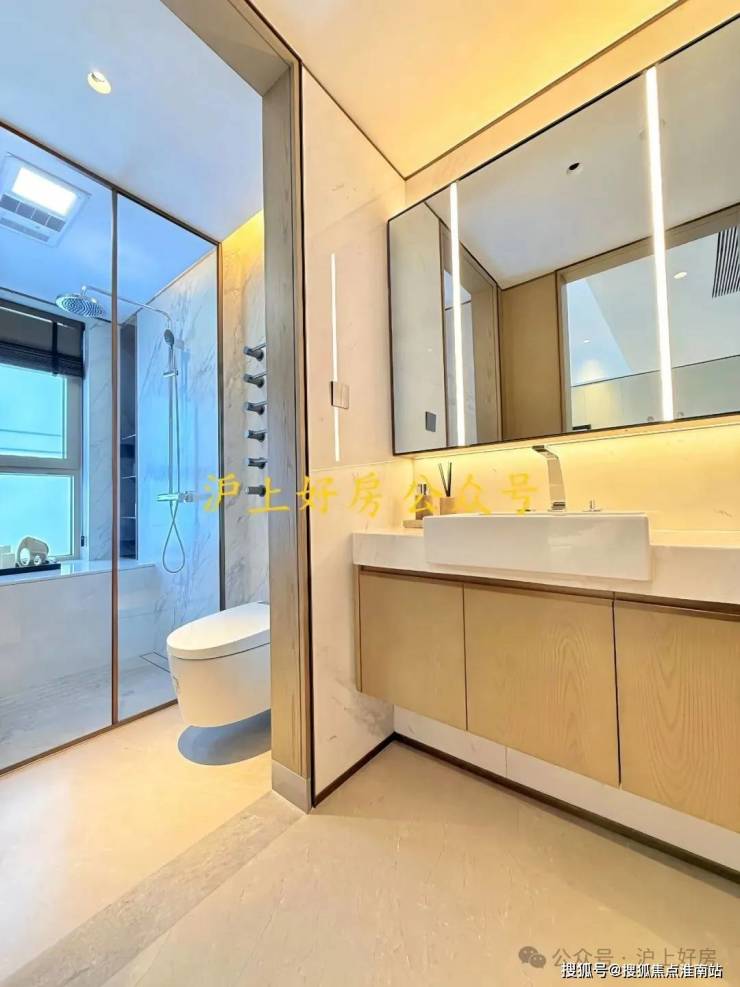 厨卫方面,西厨定制高柜,容纳嘉格纳蒸烤一体机、嘉格纳双开门冰箱、洗手台以及各类收纳空间;中厨自带嘉格纳灶具、油烟机和洗碗机。主卫配置劳芬台盆、浴缸和独立卫浴洁具空间、独立淋浴空间配备当代的花洒,顶部有松下暖风机,还配置了电热毛巾架。