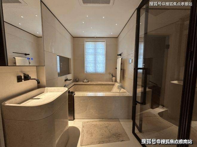 而样板间里这第二个卫浴空间,更接近于享受级。嵌入式浴缸,设计了魔镜系统,可以供业主泡澡时观影娱乐;除此之外,这个卫生间也有独立的淋浴房,并设计有桑拿房。