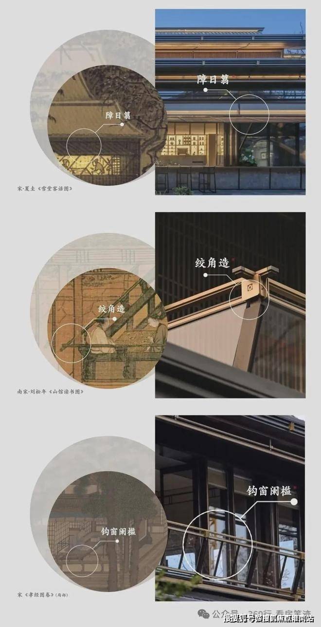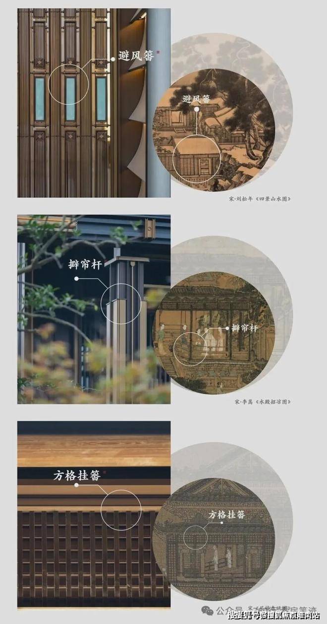 项目通过擗帘杆、方格挂沓、避风䈋、障日䈳、版引檐等20余处建筑细部符号转译,来体现"清新儒雅 精致飘逸"的美学特征。这些细节,全部是通过对宋画和宋代诗词的深入研究而来,处处有自己的故事,经得起时间的推敲。