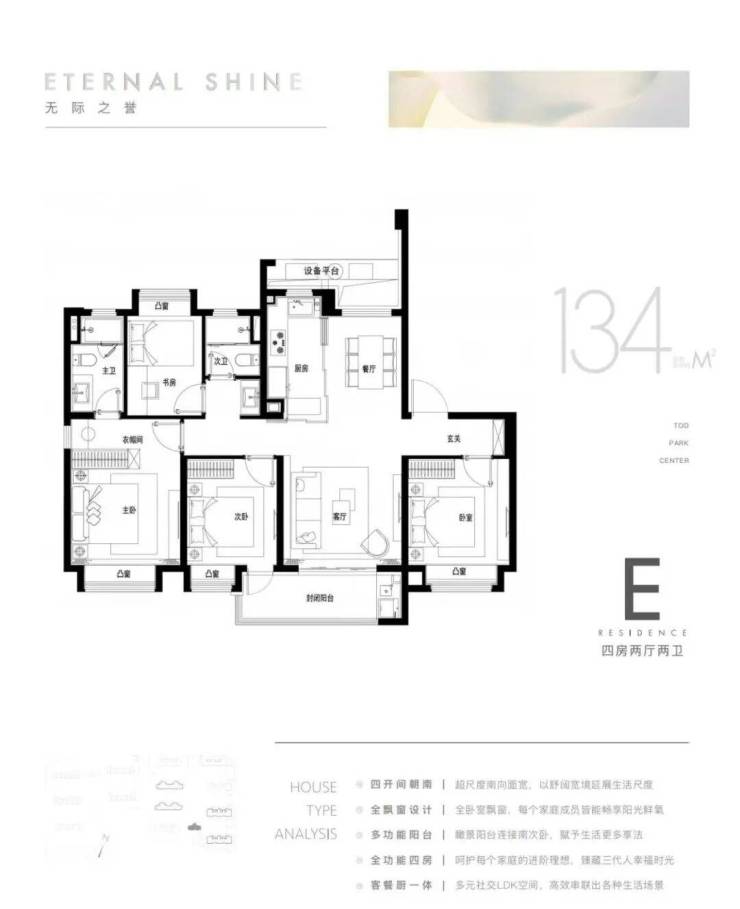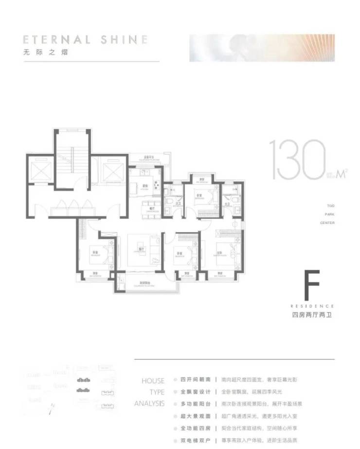 130–134㎡四房两厅两卫:四开间朝南,宽景横厅,双卫配置,适配多孩家庭